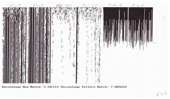 The pictures illustrate transient induced global response synchronization (TIGoRS) in a cocktail party automaton. The first two pictures show individual runs under different initial conditions and different low frequency samples of the same stimulus pattern. The third picture shows discordance between the first two runs. The fourth picture shows discordance between the first run and the stimulus. The final two pictures show the distributions of the rules at the end of each run.