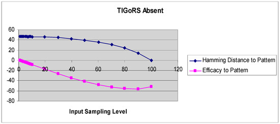 A more refined measure of TIGoRS was introduced in Reference [27]. The efficacy of TIGoRS was defined as , where P is the percentage of pattern cells sampled, H(0) is the percentage Hamming distance between the current automaton response and the template response in the absence of input, and H(p) is the percentage Hamming distance between the template response and the current automaton response under input by pattern p with sampling P. Efficacy and the Hamming distance curves, with and without TIGoRS, are presented in Figure 2 and Figure 3.
