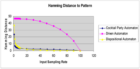 Figure 4 shows the Hamming distance curves for a driven cellular automaton, cocktail party automaton, and a dispositional cellular automaton under the same stimulus pattern.