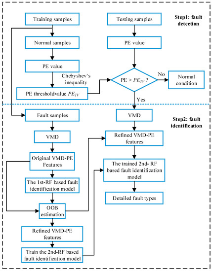 According to the fault evaluation law of rolling element bearing and the human intelligence way, a two-step fault diagnosis scheme that included fault detection and fault identification was proposed in this work. As shown in Figure 2, a statistical classification model and one fault classifier based on random forests were constructed respectively in different steps. In the first step, the statistical distributions of the permutation entropy of vibration signals can be obtained based on historical status data analysis, and then it was used to realize preliminary judgment of the equipment health condition. In the next step, the specific fault types were identified by employing the random forests-based diagnostic model where the VMD-PE features were considered as inputted data. Furthermore, the importance of each scale PE feature was evaluated by OOB estimation and the original VMD-PE features were refined. The detailed implementation of each stage will be explained next.