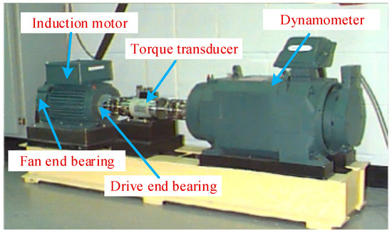 In this section, the experimental data freely provided by Bearing Data Center of Case Western Reserve University is employed to validate the proposed diagnosis method. As shown in Figure 3, the experimental setup consists of a 2 hp Reliance Electric motor (left), a torque transducer (middle) and a dynamometer (right) [47]. The testing bearings installed on both ends of the motor housing support the motor shaft, where the type of the testing bearings is the 6205-2RS deep groove ball bearing (SKF, Gothenburg, Sweden). Different faults (inner race fault, outer race fault or ball fault) were separately seeded on the normal bearings by an electric discharge machine and then faulted bearings were reinstalled into the test motor. Four defect sizes (0.0178 cm, 0.0356 cm, 0.0533 cm and 0.0711 cm) were processed on the inner race fault and ball fault bearings, and three defect sizes (0.0178 cm, 0.0356 cm, 0.0533 cm) were processed on the outer race fault bearings. Here, vibration data under different fault conditions were collected from the acceleration sensor installed on the drive end of the motor housing with different loads of 0 to 3 hp (motor speeds of 1797 to 1720 rpm). The signal sampling frequency was 12 kHz, and the data length of each working condition was 120,000 points.
