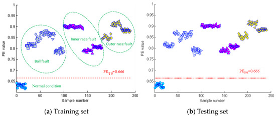 where and are the mean value and variance of PE values of normal bearings respectively, and the probability upper bond is actually the false alarm rate. It means that the probability of the PE values of normal condition with greater than should be no more than . Here, the upper bond can be set as the threshold value. Let PE(i) denotes the i-th data point of PE. Then, for N samples, its health judgment threshold value can be obtained as: