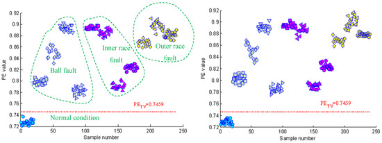 In reality, fault early warming is very important for the prevention of fault expansion. When bearing faults occur, the high-frequency impulse parts motivated by faults make the vibration signals more complex. According to related theory, the PE values of fault signals are larger than that of normal signals, and this property can be employed to detect early faults [30]. Consequently, when the statistical classification method is used to judge the bearing health condition, how to determine the threshold value in terms of PE distributions becomes an important issue.