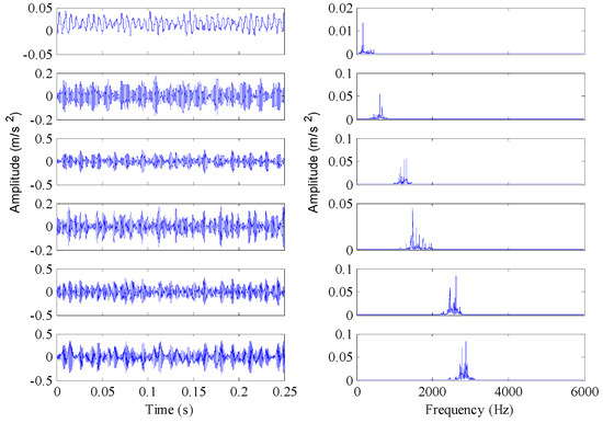 Although the PE features perform well in detecting faults, the detailed fault types cannot be classified only based on the single-scale PE features. As shown in Figure 5 and Figure 6, there are serious aliasing regions of the PE values with different fault conditions in the vertical direction. In the fault identification stage, the PE features of each BLIMF component were extracted to construct the fault classifier and to attain the final diagnosis results. Next, the vibration signals were decomposed by VMD with K = 12, where K can be determined based on the observation of the center frequency of each BLIMF [48]. Figure 7 gives the decomposed results of one vibration signal with inner race fault and the frequency spectrogram of each BLIMF. For convenience sake, only the first six BLIMF components were displayed in Figure 7. Clearly, the original complicated signal can be decomposed into a series of mono components with relatively single frequency information. So the frequency characteristics contained in the original fault signals can be easily extracted from each BLIMF component. As a result, multiscale PE features extracted from each BLIMF component can provide a more abundant description of the dynamic characteristics of the vibration signals compared with the single scale PE features. The distribution dissimilarity of the VMD-PE features with different fault types and the aggregation of the VMD-PE with the same fault type are displayed in Figure 8. As shown in Figure 8a, the VMD-PE performs good differentiability for different fault conditions. Meanwhile, the VMD-PE distributions with same fault type performs good clustering, as illustrated in Figure 8b–d, where the lines with different colors in each figure represent the variation trend of VMD-PE values of different signal samples with the same fault type. The results demonstrate that VMD-PE is one kind of feasible fault features for bearings fault identification.
