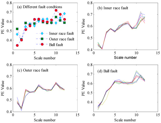 Due to the non-linear dynamic characteristics of bearings’ fault vibration signals, the traditional feature extraction methods based on Fourier transform and statistical analysis are no longer adequate for the effective and accurate diagnosis of bearing faults. Recently, various complexity measurement methods derived from information theory are proposed to characterize the vibration signals [9,10,11]. The widely used methods include energy entropy (EnE) [10,12], sample entropy (SE) [13,14], approximate entropy (ApEn) [15,16] and fuzzy entropy (FE) [17]. Although these methods have made certain achievements in the health monitoring and fault diagnosis of rotating machines, they still possess some deficiencies [8,11,18]. Permutation entropy (PE), as a non-linear dynamic parameter, was introduced by Bandit and Pompe to measure the randomness and dynamic mutation of time sequences [19]. Based on its advantages of intelligibility, low time consumption and strong robustness, PE has achieved many successful applications in the fault diagnosis of rotating machines [20,21,22,23].