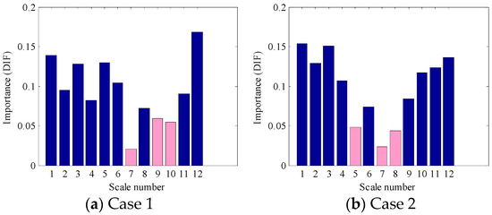 As displayed in Figure 7, each BLIMF contains certain frequency information, but it does not mean that each component could play a positive role in fault identification. Actually, the interference components or the components with less condition information will seriously block the proper identification of faults and are hard to distinguish and eliminate. In this work, the OOB estimation was used to evaluate the PE features importance of each BLIMF component to further refine the original VMD-PE set. The importance value of each scale PE feature is displayed in Figure 9, where the PEs of 7, 9 and 10 scale number contribute less to fault classification. Meanwhile, to avoid excess information loss only the first three PE features with small importance value were removed from the original MPE features. As the estimation results presented in Figure 9b, the PEs of 5, 7 and 8 scale number are eliminated in Case 2.