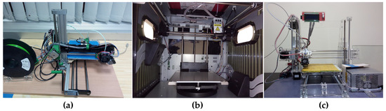Three devices used for preparation of samples used in experiments: (a) RepRap Pro Ormerod 2; (b) da Vinci 1.0 Pro 3-in-1 (view of inner parts); and (c) Prusa i3.