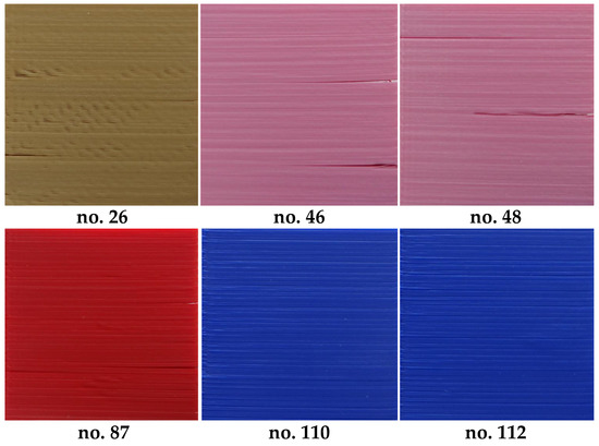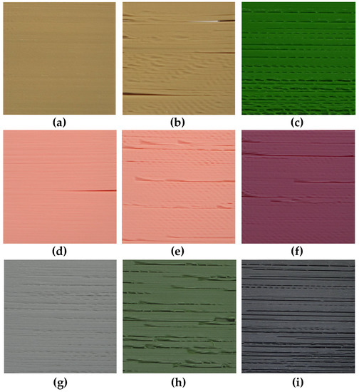 Some of the samples were intentionally distorted by forcing “dry printing” and some changes of filament’s delivery speed or temperature as well as parameters of stepper motors. Some of such obtained distortions, including the presence of cracks in some of the ABS samples, are illustrated in Figure 2. The only high quality sample (Figure 2a) is an illustration of properties of the surfaces that were subjectively assessed as representing high quality, whereas the sample in Figure 2d was evaluated as moderately high quality due to the presence of a single crack and minor visible distortions. The remaining seven images are examples of low quality surfaces.