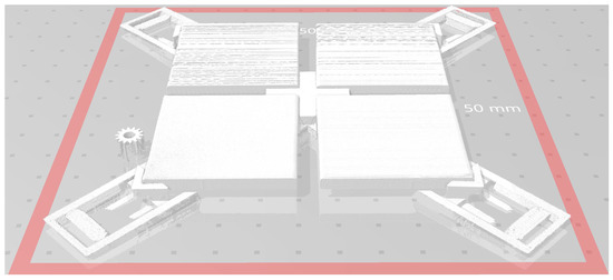 After the first attempts made with the use of previously developed 3D scanning system [25,26], in further experiments the more precise ATOS device manufactured by GOM company was used for the verification of the idea. During the experiments, precise fringe patterns were projected onto the scanned surface of the object and captured by two cameras based on the stereo camera principle allowing to scan the reflective surfaces more precisely (to several micrometers). However, it is worth noticing that projected fringe patterns should not be parallel to the visible layers and therefore the perpendicular patterns were used during the 3D scanning. The obtained cloud of points can be stored in the popular STL format, as shown in Figure 3, illustrating the exemplary scan of four 3D printed samples mounted in the dedicated mounting holders.