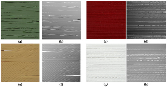 Such obtained STL files were converted into normalized depth maps stored as pixels 16-bit greyscale images, representing the surfaces of the 3D printed and scanned samples. Some exemplary depth maps together with photos of respective samples obtained for green, red, brown and white lower quality 3D prints are presented in Figure 4, whereas similar examples obtained for high quality surfaces are illustrated in Figure 5.