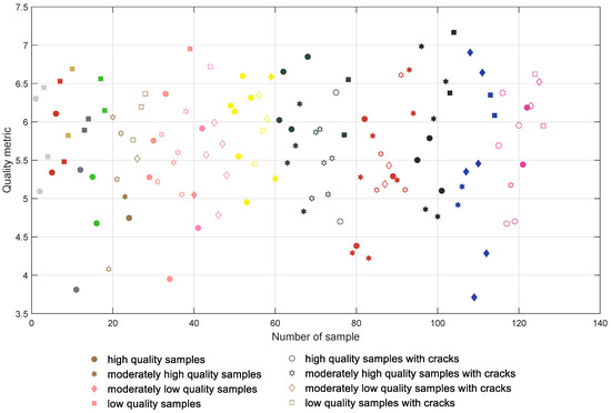All plots presented in Figure 6, Figure 7, Figure 8 and Figure 9 should be interpreted considering the high values of all presented quality metrics as equivalent to low quality. Since the presence of local distortions causes the increase of entropy as well as its variance, higher values of the metric may be expected, which can be interpreted as a measure of the amount of distortions. Nevertheless, values close to zero might be expected only for perfectly flat surfaces which do not contain any patterns.