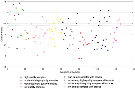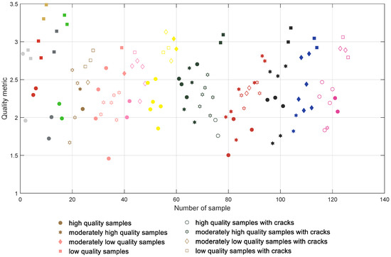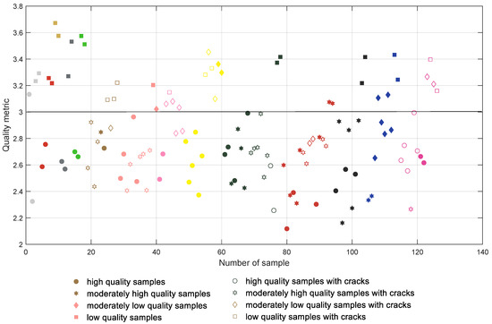 To illustrate the advantages of the proposed method numerically, some typical classification metrics were calculated for the proposed method. Assuming the classification of the samples into two classes—high quality (positives) and low quality (negatives)—true positives (TP) can be defined as high and moderately high quality samples classified as “good”. On the other hand, true negatives (TN) are properly classified distorted surfaces (low and moderately low quality). Consequently, false negatives (FN) and false positives (FP) may be assigned to improperly classified samples. Therefore, some of the most popular classification metrics, namely F-Measure (F1-score), specificity, sensitivity and accuracy, may be calculated as: