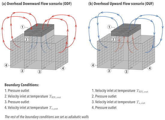 Figure 1 depicts the two overhead cooling scenarios to be studied in this work: (a) Overhead Downward Flow (ODF), or the cold aisle approach, and (b) Overhead Upward Flow (OUF), or the hot aisle approach.