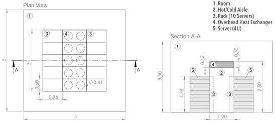 The data center room is comprised of 10 racks with 10 servers (4U) each and five overhead heat exchangers placed at the aisle ceiling. Figure 2 shows a scaled engineering drawing of the physical domain. The problem is studied dynamically (transient) and undergoes the following assumptions: