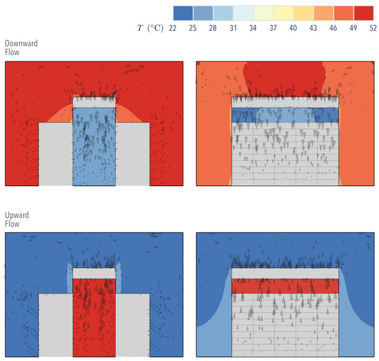 The temporal discretization considers a constant time step s employed until the flow developed s, for upward and downward cooling. When s and until the steady state was reached ( s), was varied dynamically from 0.1–1 s. This way, we accelerated the simulation and saved CPU time.