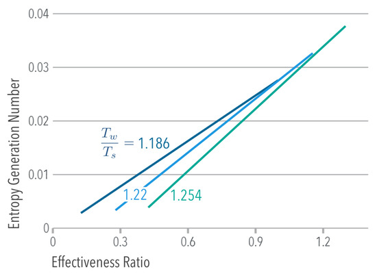 where represents the Exergy Destruction associated with the dissipation of . Equation (24) indicates that the loss of available thermal energy requires reducing down to in order to avoid increasing the Entropy Generation of the system. Furthermore, the Exergy Destruction would also increase if is allowed to achieve its maximum value. This value is obtained when both the containing walls are insulated and . Thus,