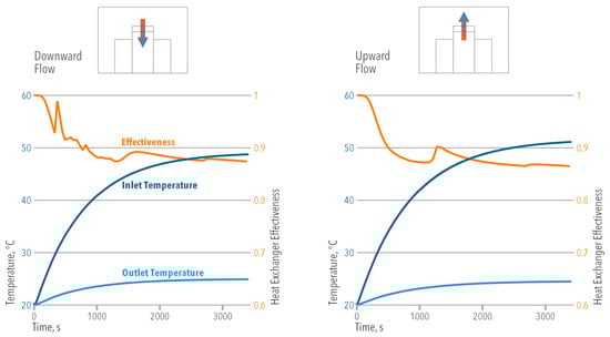 When evaluating the overhead heat exchangers, Figure 9 shows that they take longer to reach the steady state ( s). Even though a higher temperature difference () is found in the OUF cooling, the overhead heat exchanger effectiveness is greater in the ODF cooling.