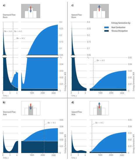 Figure 10 shows the contribution of fluid mechanics and heat transfer to the increase in the total Entropy Generation of the aisle and room. As observed, and as demonstrated in [14], heat conduction terms were mainly responsible for the increase in . When , both sources of irreversibility (fluid friction and heat transfer) contributed equally to the Entropy Generation. At this point , which is the Bejan number [24] defined as: