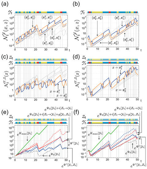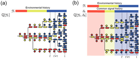 where is the number of cells at time t that have phenotypic and individual sensing histories, and , under the realization of environmental history . Similarly, is the number of cells at time t that have phenotypic history, , under the realization of environmental and common sensing histories and . Thus, and can be interpreted as the probabilities of observing a phenotypic history when we trace the phenotypic history from time t to time 0 in a time-backward manner, retrospectively [26,27,29]. In contrast, is the probability of observing when we trace the phenotypic history in a time forward manner [26,27,29]. The difference between the two is attributed to the impact of selection, which can be characterized by investigating a population after selection, retrospectively.