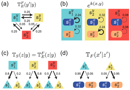 where is the Bayesian posterior of the environmental state, , given the information of the sensed signal and the previous environmental state . In this procedure, we switch the causal order of and by using Bayes’ theorem. Then, by using Equations (15) and (21) can be rearranged as