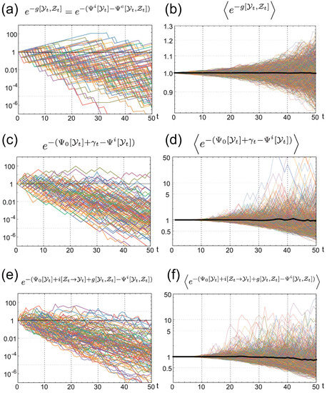 which clarifies that fluctuates, such that the positive balances the negative to satisfy the equality. The integral FR is also verified numerically in Figure 5a,b.