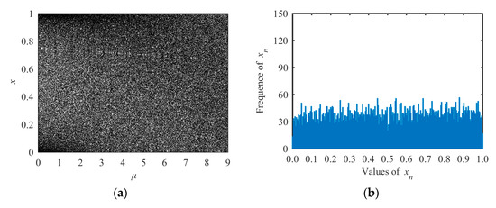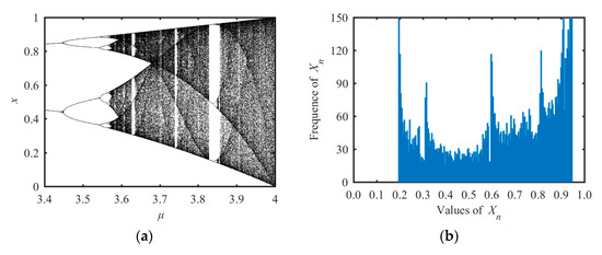where μ is the system parameter in the range of [0, 4]. In order to determine the range of parameters corresponding to its chaotic phenomena, we calculated Lyapunov exponents under different parameters μ and found the chaotic rang of logistic map was μ ∈ [3.57, 4]. The bifurcation diagram of logistic map is shown in Figure 1a and the state distribution under μ = 3.78 is shown in Figure 1b.