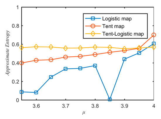 There are many techniques to evaluate the system complexity from time sequence [39,40,41]. One of the most famous methods is approximate entropy [41]. The greater the approximate entropy, the higher the complexity of the time sequence. To measure the complexity of sequences generated by different chaotic systems, the approximate entropy values of the sequence generated by the three chaotic maps are calculated and shown in Figure 4. From Figure 4, one can see that the approximate entropy values of sequence generated by the tent–logistic map were the largest ones among the three chaotic maps in the cases of most μ values. It verified that the sequence generated by the tent–logistic map had larger complexity than tent and logistic maps.
