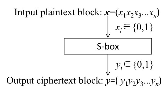 An S-Box is the only non-linear component in a block cipher system. It plays an important role in symmetric block cipher cryptosystems. An S-Box is like a black box. It transforms any input plaintext block into a ciphertext block, which can confuse the relationship between ciphertext and plaintext. A general m × n S-Box is a map: {0, 1}m→{0, 1}n. When n = m, it means that data are neither compressed nor expanded during encryption transformation. In this case of n = m, the S-Box can realize completely reversible transformation. Most S-Boxes commonly used in cryptography are m = n. The function and basic principle of an n × n S-Box can be shown in Figure 5.