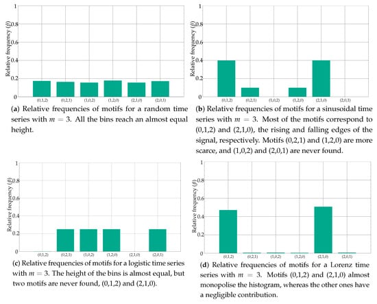 Figure 1 depicts the histograms for a few popular synthetic time series, as an example of the distribution of these relative frequencies. Specifically, the histogram in Figure 1a belongs to a random time series with a uniform distribution, as can be inferred from the equality of the bins. At the opposite end of the spectrum of randomness, Figure 1b shows the histogram of a sinusoidal time series, with a more polarised distribution of motifs, some of them forbidden (zero probability) []. Figure 1c,d shows the histograms of other time series with a different degree of determinism, a Logistic (coefficient 3.5) and a Lorenz (parameters 10, 8/3 and 28) time series, respectively [,]. When computing the associated entropy to the relative frequencies shown in Figure 1, the single value obtained will be arguably very different in each case.