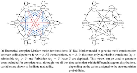 However, not all the transitions between ordinal patterns are possible, as there are two samples overlapping between consecutive subsequences. Therefore, the order and values of the last two samples of subsequence have to be the same for the two first samples of . In practical terms, these forbidden transitions will be represented by a specific , in contrast to the possible or admissible transitions, where . This will be explained in more detail in next section. The resulting model applying these constraints is shown in Figure 2b, and this is the model that will be used to generate synthetic time series.