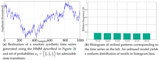Using the model in Figure 2b, and a suitable random excitation, the time series of any length with subsequences whose ordinal patterns are equally or unequally probable can be generated easily. As an example, see Figure 3a, whose histogram in Figure 3b resembles that of a random time series, like the one shown in Figure 1d. The random excitation determines the final transitions that take place at each t from an initial random state. The path followed, in terms of , chains the ordinal patterns emitted, and from these ordinal patterns, subsequences of time series values are also randomly generated, ensuring they overlap with the previous ones and abide by the order emitted. These subsequences are generated ensuring also that ties do not take place, and therefore a clear falling or rising trend may be exhibited, depending on the dominant ordinal pattern, if any.