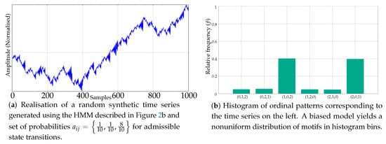 If the transition probabilities are not equal, what we obtain is a biased model instead that results in a nonuniform histogram of ordinal patterns. For example, Figure 4a shows a synthetic time series resulting from probabilities . Its histogram is depicted on its right, in Figure 4b.