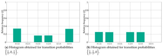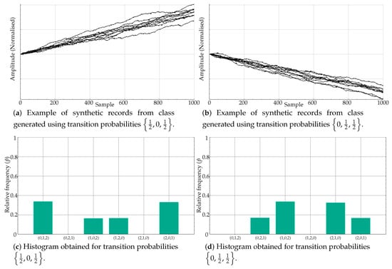 However, the results in Table 3 for and , despite having a similar transition probability set of values, are completely different from an histogram perspective, and that is why the classification accuracy was 100%. This is very well illustrated in Figure 7a,b.