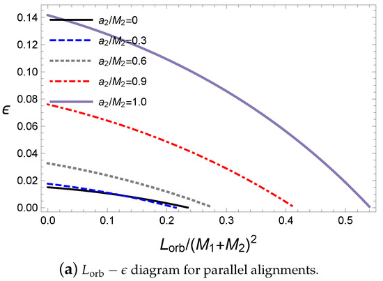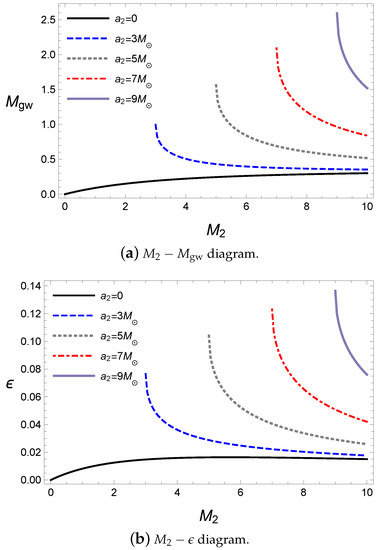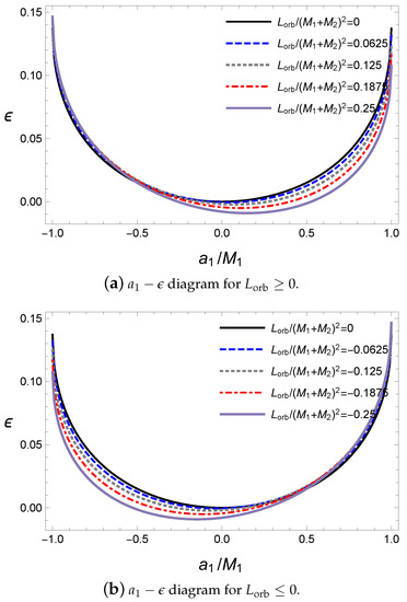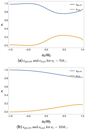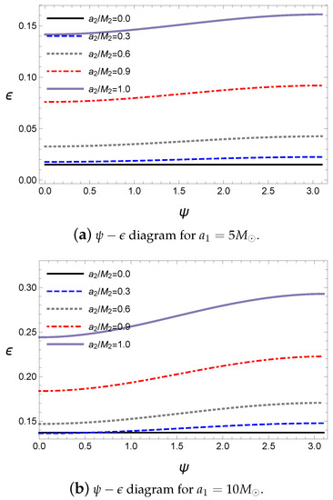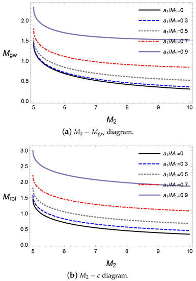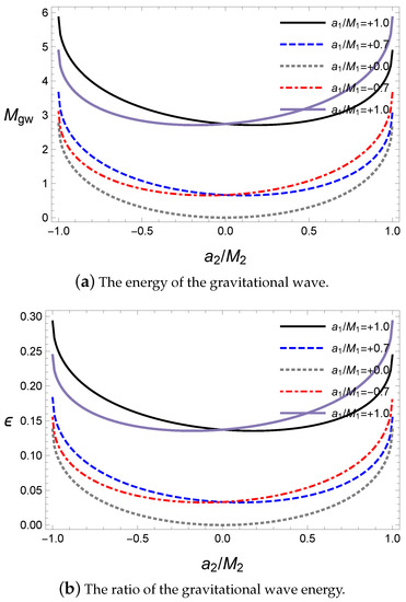This is expected because a greater spin parameter for a given mass has more rotational energy in the initial state. The ratio also behaves in the same way, as shown in Figure 4b. Only the case of increases as increases, where the secondary black hole is a Schwarzschild black hole; thus, the increase in the secondary black hole’s mass induces more rotational energy from the primary black hole.