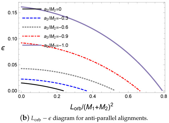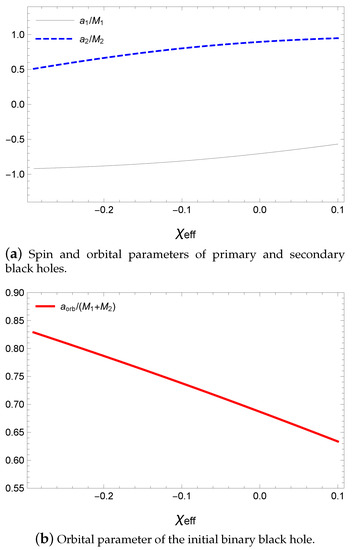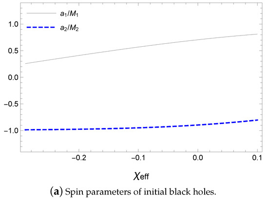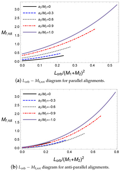 The alignments with rotating axes are dependent on the sign of in Figure 1. For a plus sign, the two black holes are in a parallel alignment and for a minus sign, they are in an antiparallel alignment. In Figure 1a, the released energy is the largest at the extremal values where the rotational energy of the secondary black hole is maximum because is emitted from the reducible energy such as the rotational energy. Hence, the amount of energy is proportional to the rotational energy in the initial state. For the alignments, the released energy is greater in an antiparallel alignment than in a parallel one owing to the contribution of the gravitational spin interaction, as expected in Equation (47). Owing to the dependence on the alignment, the minimum point of the released energy is located at the parallel alignment for a given rotational axis of the primary black hole. The ratio of the released energy with respect to the initial mass is shown in Figure 1b. Interestingly, , which is similar to that of the LIGO observations of about 3– [1,2,3,4,5]. This implies that our approach based on the irreducible mass can provide results consistent with observations. Further, this supports the fact that most of the released energy originates from the reducible energy of the initial state of the binary system. Note that this is an improvement of lowering the upper limits given in previous studies [52,53,67] to a realistic level.