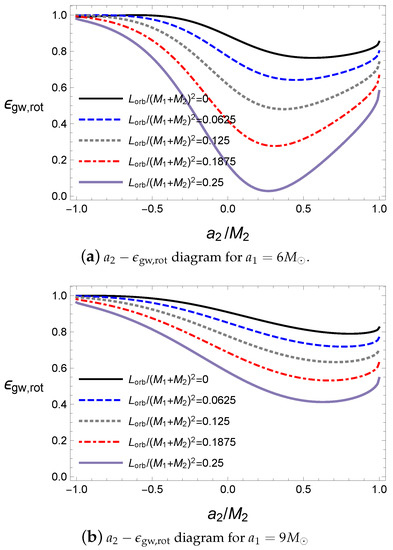 We now investigate the energy of the gravitational wave with respect to the alignments of the spin angular momenta during coalescence. Here, the final black hole and released gravitational wave energy are obtained from Equations (24)–(29) by solving the numerical method. The effects of the spin parameters in the initial state are shown in Figure 1 with respect to the second black hole’s spin parameter for a given value of the first black hole’s spin parameter.