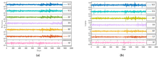 (a) The return series of energy futures and spot data; (b) The VMPD series of energy futures and spot data.