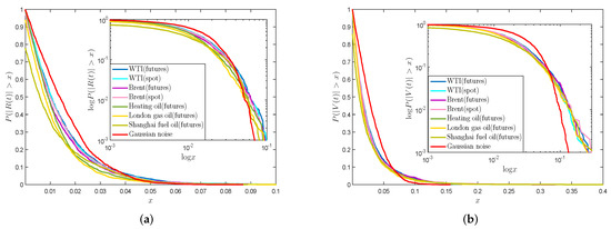 Figure 4a,b display the plots and log-log plots of cumulative distributions of absolute return series and absolute VMPD series . Figure 4 exhibits that and series for the energy data from diverse markets have parallel tracks of cumulative distributions. It is clear that for both and series of these analyzed energy data are all below the normal distribution, which illustrate that they have fat tails. Moreover, the tail of each curve is close to a straight line, which indicates that the tails of all data obey the power-law distribution. All time series are fitted with the last data, and Table 2 shows the estimation values of and . From Table 2, we can see that the values of exponent parameter are basically around −3, and the absolute value for series is bigger than that for series in general. It is noted that the R-square values are all over 0.95, which shows that the tails of energy and series can be fitted by the power-law formula.