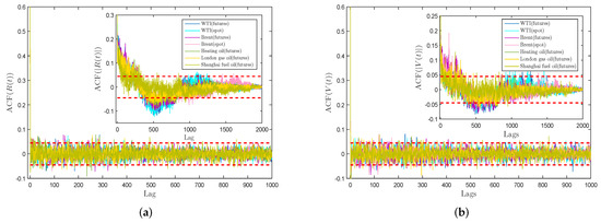 Figure 5 displays the autocorrelation functions of and of energy data sets related to distinct time lags. The red dashed locates in each graph stand for the confidence interval. For and , the ACF values stay in the confidence interval as the time lag grows, that is, the autocorrelation of each time series gradually disappears with the increase of time lag, which indicates that future data is independent of historical data for and . The absence of autocorrelation for returns series at large time lag suggests that the weak-form Efficient Market Hypothesis (EMH) may support these energy markets in the long run, and investors may not be able to use the technical means to gain profit-making opportunities [56,57]. For and , the two inset graphs exhibit that the shapes of autocorrelation function are parallel. They firstly decay slowly, and then go up as the lag value increases. In the end, nearly all the ACF values are in the confidence interval. This is consistent with the empirical fact that security markets do not exhibit any significant autocorrelation.