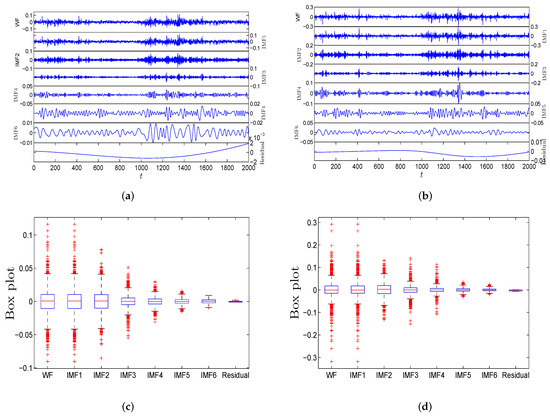 In order to better illustrate the above algorithm, Figure 6 shows the flow chart of the EEMD method. Figure 7a,b show the decomposition results of and of WF by the EEMD algorithm. The plots show five IMFs (IMF1 to IMF5) and one residual. Figure 7c,d show the box plots of five IMFs to represent the basic statistical information, which clearly indicate that the fluctuation scale of IMF1 to IMF5 decreases successively.