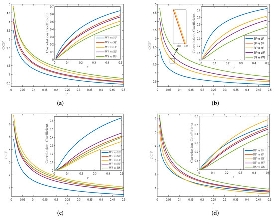 (a) CCF values of WF returns and WS returns with other energy items; (b) CCF values of BF returns and BS returns with other energy items; (c) CCF values of WF and WS for VMPD series with other energy items; (d) CCF values WF and WS for VMPD series with other energy items.
