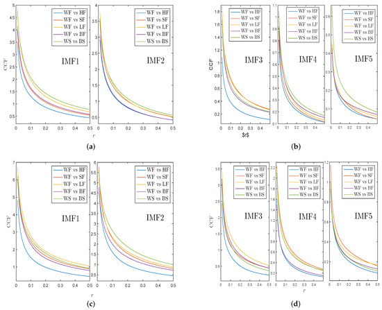 Next, we decompose returns and VMPD sequences of different energy data into corresponding IMFs by applying the EEMD algorithm to explore whether IMFs have analogical complexity synchronization behaviors as initial security time sequence. Figure 9a,b exhibit the CCF values of IMFs of WF returns and WS returns with other energy items. Figure 9c,d show the CCF values of IMFs of WF and WS for VMPD series with other energy items. IMFi () represents the ith IMF. In Figure 9, all the curves are smoother and have almost the same order as the curves in Figure 8a,c. This indicates that IMF1 and IMF2 retain most of statistical characteristics of the initial time sequence. In general, the IMFs obtained by the EEMD method partly have the complexity synchronization properties of the initial sequence, while the IMF1 and IMF2 sequences retain most information about the original sequence.