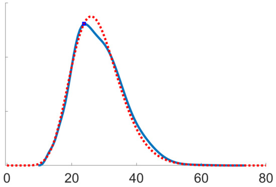 where log denotes the symmetric matrix logarithm [30]. Figure 2 confirms the asymptotic efficiency of the recursive estimates , stated in (iii) of Proposition 5, using Remark 4. It shows a kernel density estimate of where (solid blue curve). This agrees with a -distribution with 28 degrees of freedom (dotted red curve), where is indeed the dimension of the parameter space for .