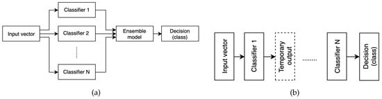 (a) Combining the results via simple voting, weighted or highest confidence voting, or other methods. (b) Multilevel classification.