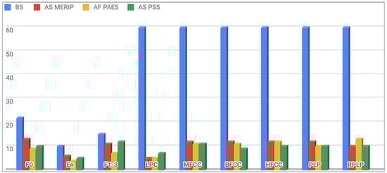 | PSSD | F0: mean, kurtosis; energy: median, std; F1:mean, median; F3: min, std; LPC mean: 5–7,10,11; MFCC mean: 1,3,9–11; MFCC std: 11,12, MFCC median: 1,7; MFCC min: 7; MFCC max: 1; BFCC mean: 1–4,10; BFCC median: 2,6,9; BFCC min: 1,5–8; BFCC max: 1–3; PLP mean: 5,6,10,12; PLP std: 3,7,10; PLP min: 1; PLP max: 8,9; RPLP mean: 1,3,5,9; RPLP median: 3; RPLP std: 5,9–10; |