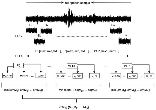 Proposed algorithm, presented in see Figure 3, starts with division of the HFL feature vector, describing speech samples, into separate sub-vectors of particular group of features (i.e., sub-vector with MFCC coefficients). Each sub-vector is subjected to the selection process, followed by classification using different models M (e.g., M1: k-NN, M2: MLP etc.). Subsequently, among the models operating on particular sub-vector, one model with the lowest error rate is selected for further analysis. The error rate is calculated according to Equation (1). Final voting is done among the highest scoring models for particular sub-vectors.