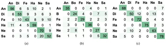 Confusion matrices presenting the best results obtained for (a) MERIP (b) PESD (c) PSSD. Emotional states: An—anger, Di—disgust, Fe—fear, Ha —happiness, Ne—neutral, Sa—sadness.