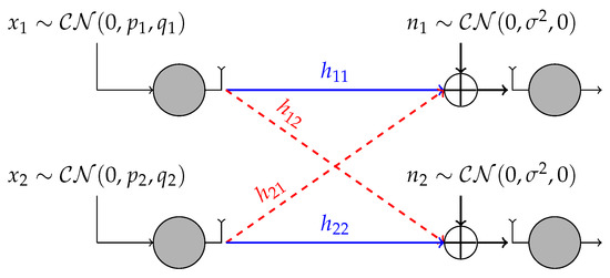 9. Lagen, S.; Agustin, A.; Vidal, J. On the superiority of improper Gaussian signaling in wireless interference MIMO scenarios. IEEE Trans. Commun. 2016, 64, 3350–3368. [Google Scholar] [CrossRef]