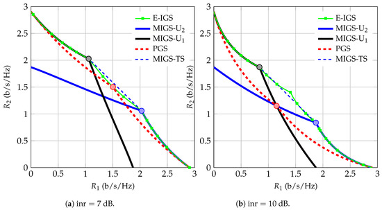 We can derive the achievable ergodic rate region by varying the transmission power of the two users. As indicated in Section 2.3, every point on the boundary of the achievable ergodic rate region is obtained when at least one user transmits with maximum power [12,41]. Thus, the whole Pareto optimal region for the PGS/IGS scheme can be derived as
