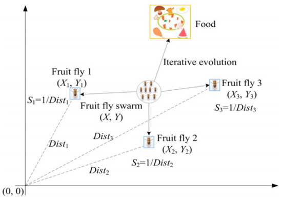 The fruit fly optimization algorithm (FOA) is a new method based on the global optimization of fruit fly foraging behavior. Drosophila is superior to other species in sensory perception, especially in terms of smell and vision. The olfactory organ can sensitively collect various scents floating in the air and can also find the location of food and companion gathering through clear vision and then fly in this direction. Therefore, the fruit fly algorithm can be applied to solve the optimal problem [18]. Figure 1 shows a schematic representation of iterative search for food in Drosophila populations. The main process of the FOA-VMD algorithm is as follows: